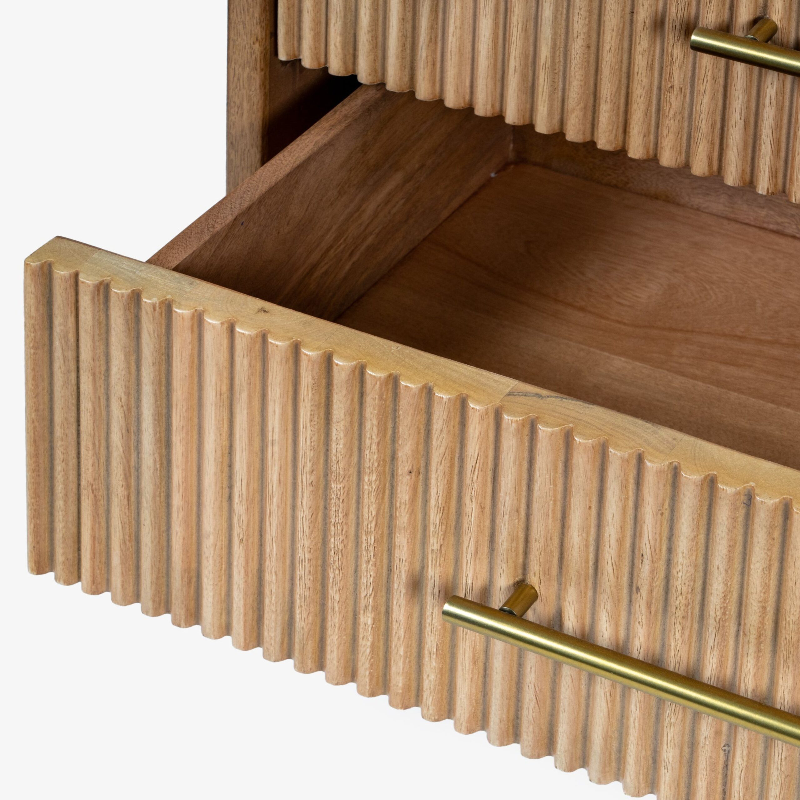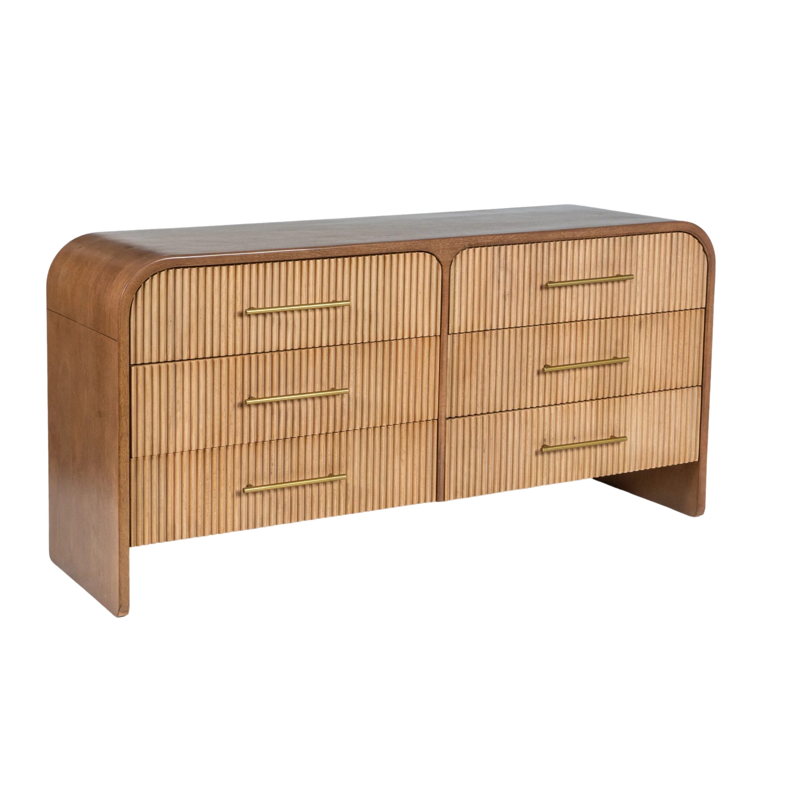 The chest of drawers beautifully combines elegance and functionality with its soft curves and intricate fluting. Made from durable mango wood and veneer, it features a two-toned walnut finish and versatile brass handles. This collection offers practical storage solutions and can be used in living rooms, bedrooms, or dining areas