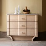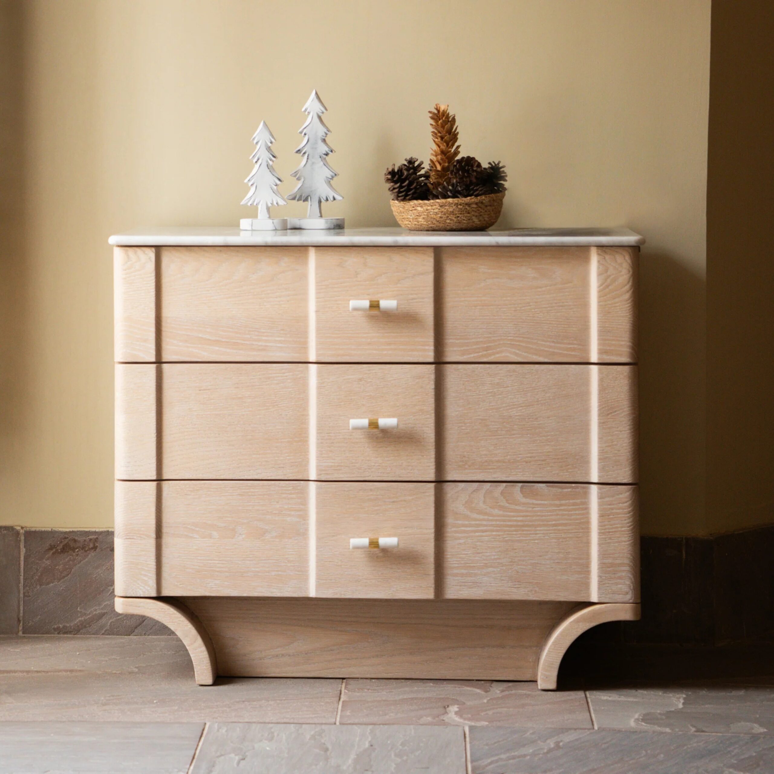 Inspired by vintage French aesthetics, the Wooden Chest of Drawers is a contemporary, design-forward furniture collection that blends by creating timeless luxury. It features solid oak wood and white Carrara marble, creating an aesthetic design.
