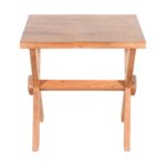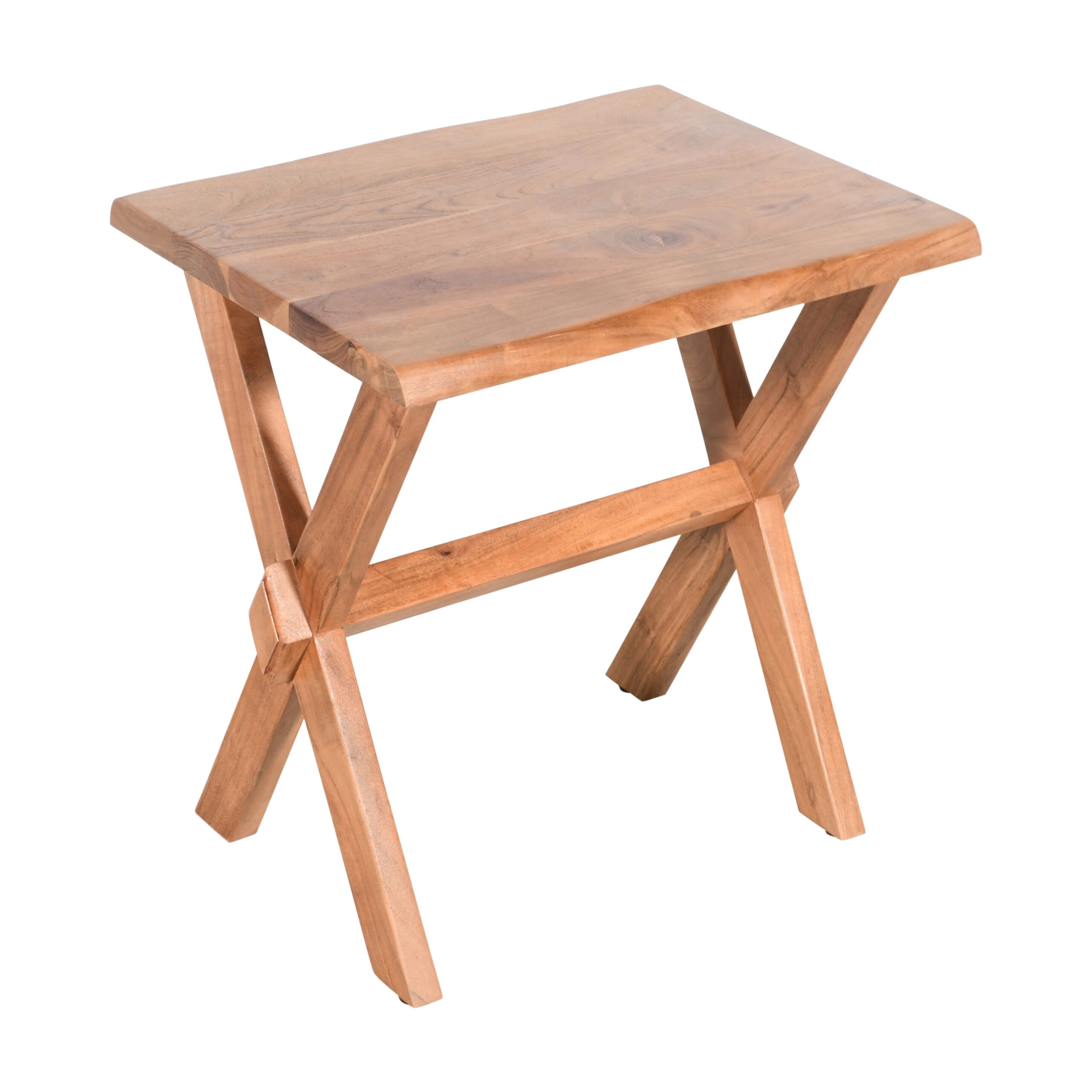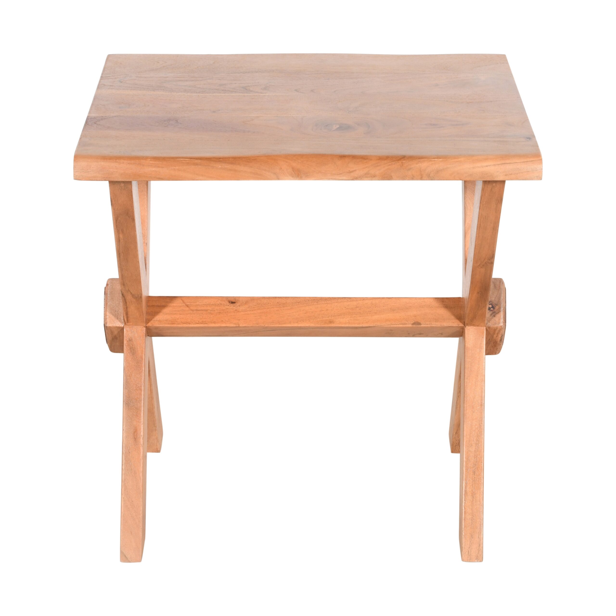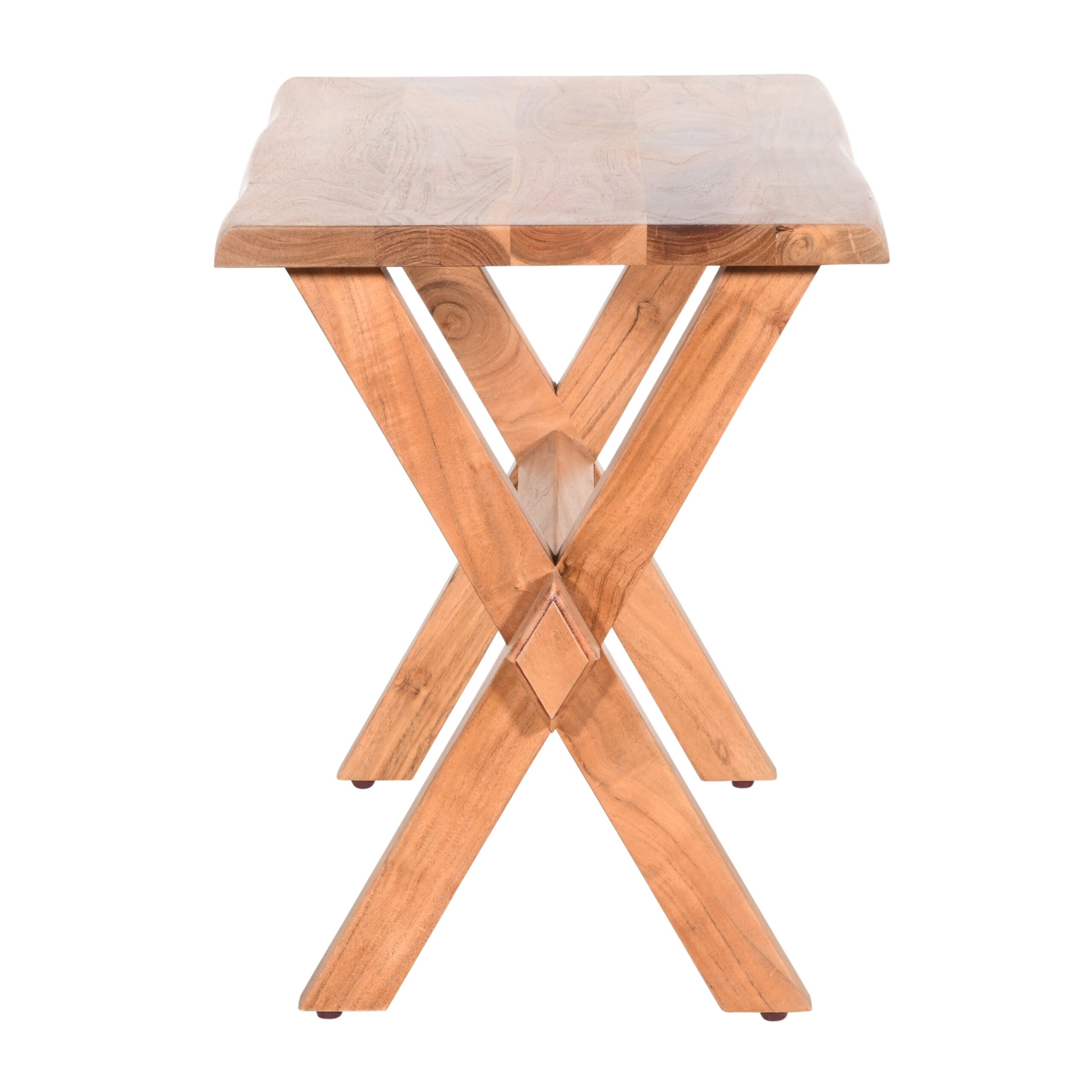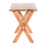 The table has a rectangular top with slightly natural, uneven edges that highlight the wood’s organic character. The legs are designed in an X-frame style, crossing each other for strength and adding a unique geometric touch. A horizontal stretcher bar connects the legs, enhancing stability. -