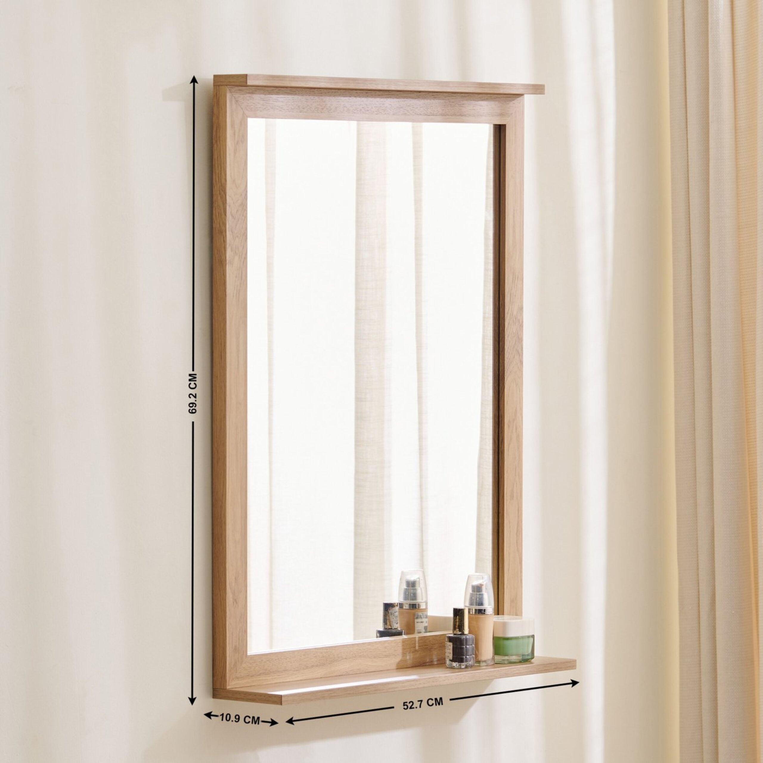 This wall mirror combines modern design with practical functionality. This stylish mirror features a sleek MDF frame and an integrated shelf, perfect for displaying decorative items or everyday essentials. Ideal for entryways, bathrooms, or bedrooms, it enhances your space while providing the illusion of depth and light.